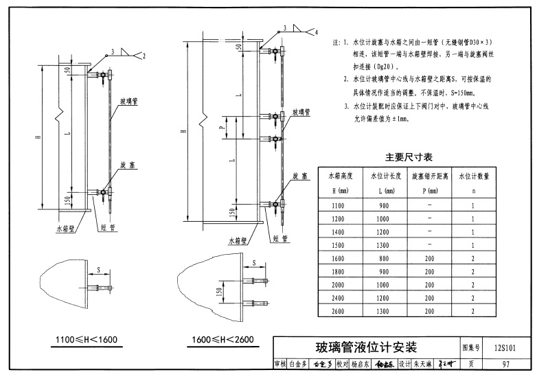 液位計(jì):一般應(yīng)在水箱側(cè)壁上安裝玻璃液位計(jì),用于就地指示水位。在—個(gè)液位計(jì)長(zhǎng)度不夠時(shí),可上下安裝2個(gè)或多個(gè)液位計(jì)。相鄰2個(gè)液位計(jì)的重疊部分,不宜少于70 mm,見(jiàn)圖。若在水箱未裝液位信號(hào)計(jì)時(shí),可設(shè)信號(hào)管給出溢水信號(hào)。信號(hào)管一般自水箱側(cè)壁接出,其設(shè)置高度應(yīng)使其管內(nèi)底與溢流管底或喇叭口溢流水面平齊。管徑一般采用DNl5信號(hào)管可接至經(jīng)常有人值班房間內(nèi)的洗臉盆、洗滌盆等處。若水箱液位與水泵連鎖,則在水箱側(cè)壁或頂蓋上安裝液位繼電器或信號(hào)器,常用的液位繼電器或信號(hào)器有浮球式、桿式、電容式與浮平式等。