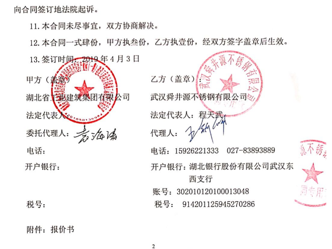 2019年4月3日,湖北省工業(yè)建筑集團(tuán)有限公司將監(jiān)利縣經(jīng)濟(jì)開發(fā)區(qū)產(chǎn)業(yè)園(一期)建設(shè)工程不銹鋼水箱轉(zhuǎn)包給我公司,并于湖北省工業(yè)建筑集團(tuán)有限公司簽訂《不銹鋼水箱定制安裝合同》。湖北工業(yè)建筑要求我公司按合同所提供的貨物是優(yōu)質(zhì)的,符合本類產(chǎn)品國家技術(shù)標(biāo)準(zhǔn)和質(zhì)量要求,且貨物質(zhì)量必須滿足設(shè)計(jì)要求及國家、地方、行業(yè)主管部門、質(zhì)量監(jiān)督部門的有關(guān)法規(guī)及規(guī)范規(guī)定,產(chǎn)品安裝驗(yàn)收完成后付至合同總價(jià)的95%,余5%在合同質(zhì)保期滿一年后一周內(nèi)付清。我公司于2019年4月15號按時(shí)完成施工,并于后一日一次性驗(yàn)收合證。