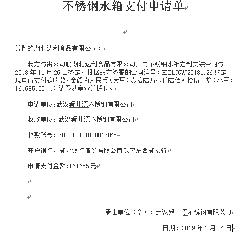 不銹鋼水箱進(jìn)度款支付申請表