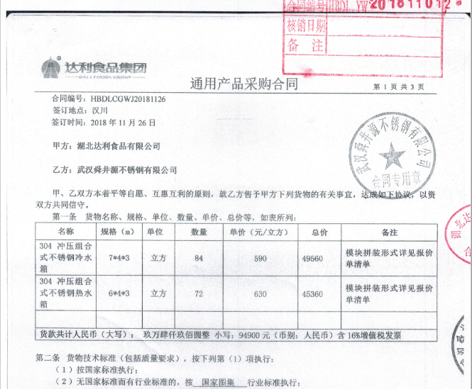 公司與湖北達(dá)利園集團(tuán)已是合作伙伴了,這次要做的是一臺(tái)72噸不銹鋼冷水水箱,一臺(tái)84噸熱水水箱,這回是6號(hào)工廠生產(chǎn)線,合同簽訂完畢后按約定期限生產(chǎn)安裝,并于2018年11月30日安裝完畢。經(jīng)達(dá)利園集團(tuán)領(lǐng)導(dǎo)驗(yàn)收合格后一次性支付工程尾,附合同。
