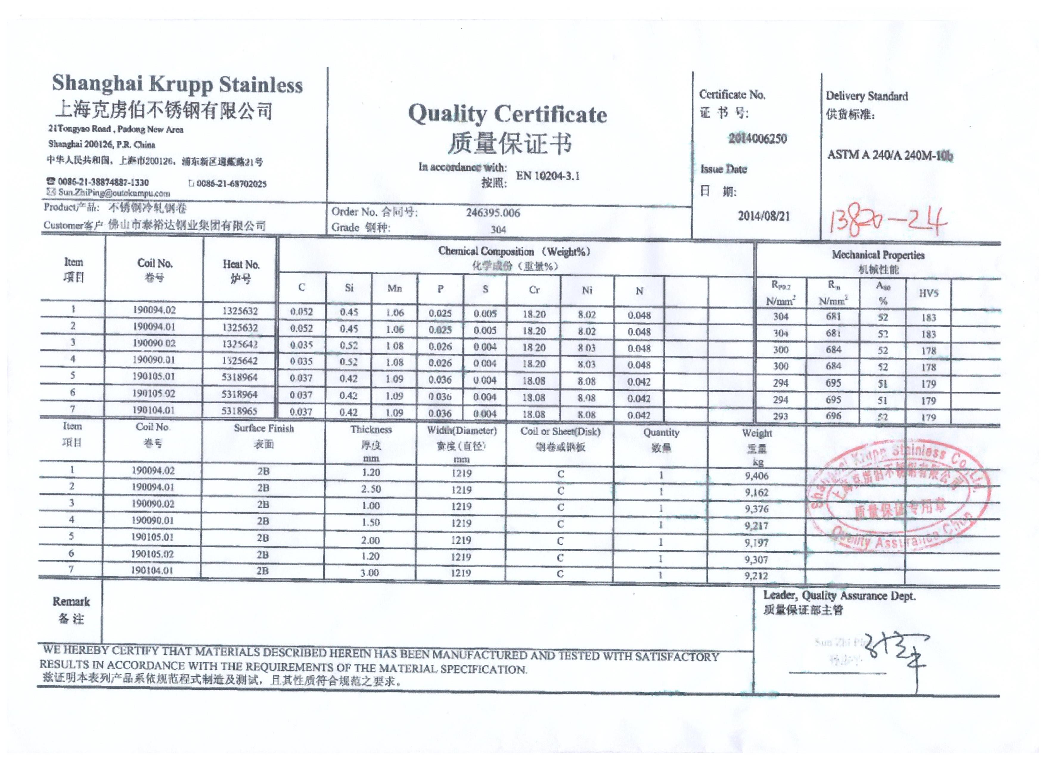 304不銹鋼水箱材質(zhì)檢驗(yàn)報(bào)告