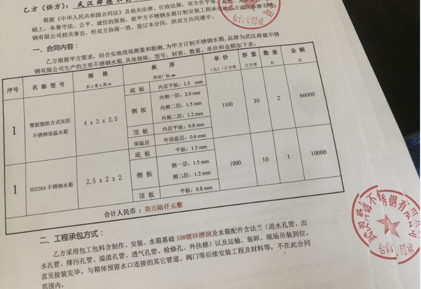 11月29日與十堰水都匯娛樂的齊總簽定二臺(tái)30噸不銹鋼保溫水箱和一臺(tái)10噸不銹鋼消防水箱,齊總要求不銹鋼保溫水箱內(nèi)外膽均采用優(yōu)質(zhì)SUS304不銹鋼板,含鎳量8%以上,保證鋼板永不生銹,防腐、耐用、發(fā)泡均勻、使用壽命可達(dá)15年以上。不銹鋼消防水箱要求外形美觀:安裝方便,工藝成熟,做工精細(xì),規(guī)格齊全,用途廣泛。我公司如期進(jìn)場(chǎng)安裝和驗(yàn)收,下面附合同及安裝完畢實(shí)物圖片。
